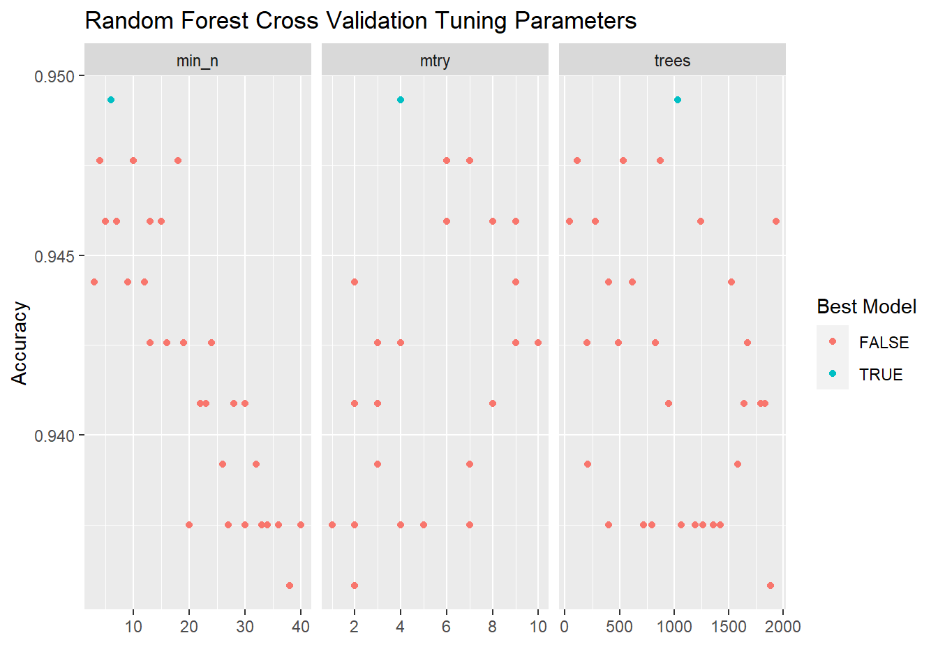 labs(y = "Accuracy", x = "", color = "Best Model", title = "Random Forest Cross Validation Tuning Parameters")