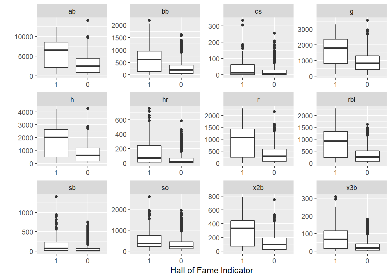 You can see from the data below, the players who make the Hall of Fame tend to perform better in a few standard baseball statistics.