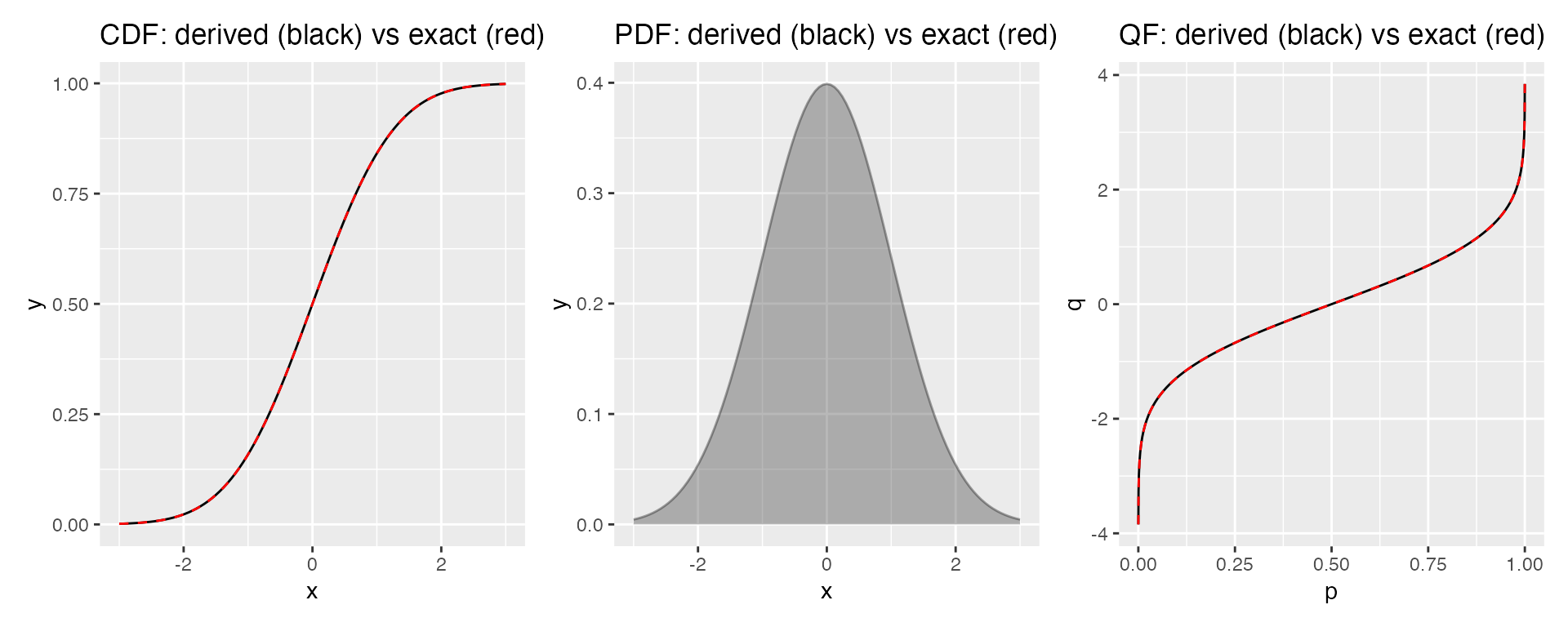We can compare derived values against the exact analytic functions to see the conversion error in practice. Here we use the standard normal distribution: