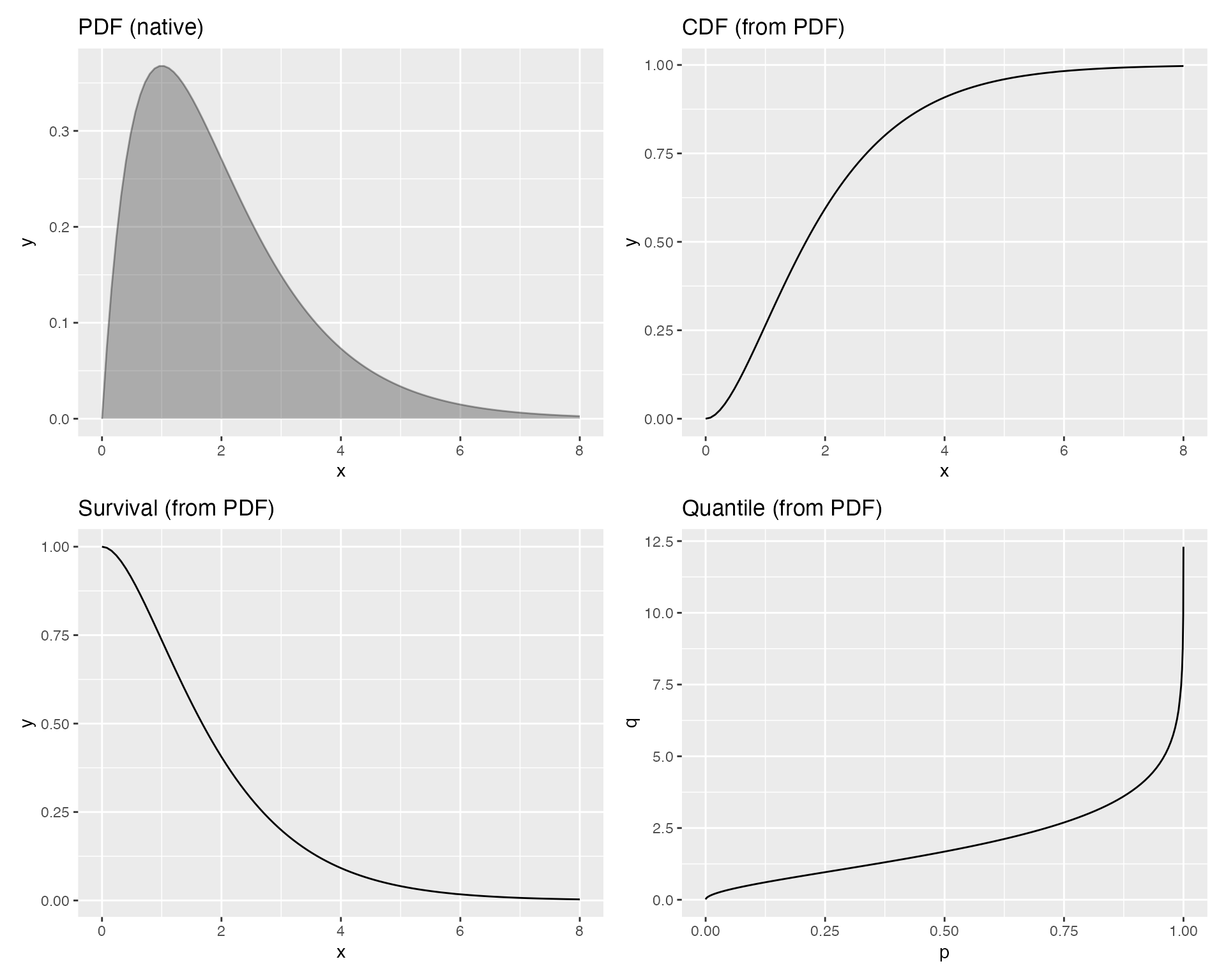 gamma_args <- list(shape = 2, rate = 1)You can plot the PDF, CDF, survival function, and quantile function without ever writing a CDF or quantile function yourself: