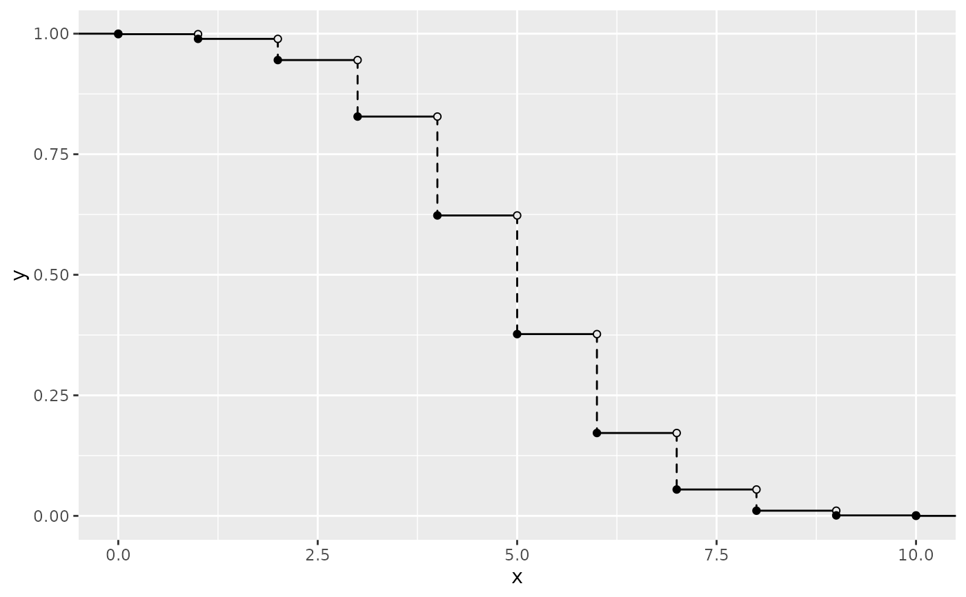 geom_survival_discrete(fun = pbinom, xlim = c(0, 10), args = list(size = 10, prob = 0.5))