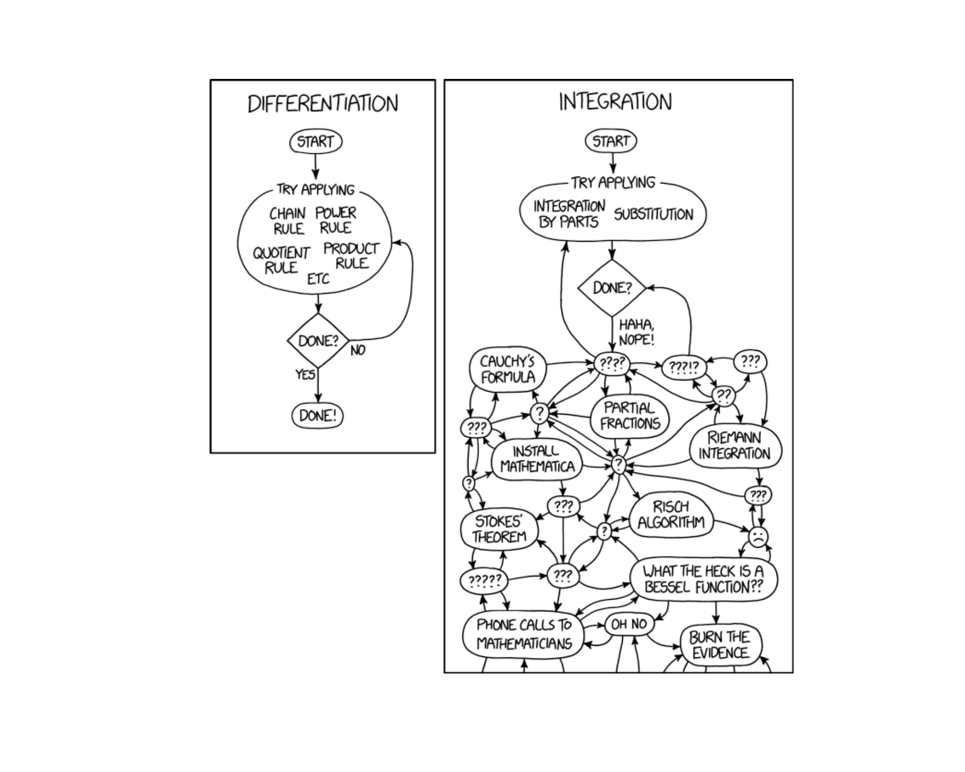 Today we start computing probabilities by integrating PDFs. As this comic shows, differentiation is mechanics — integration is art. The good news: most of our integrals today are just rectangles and triangles.