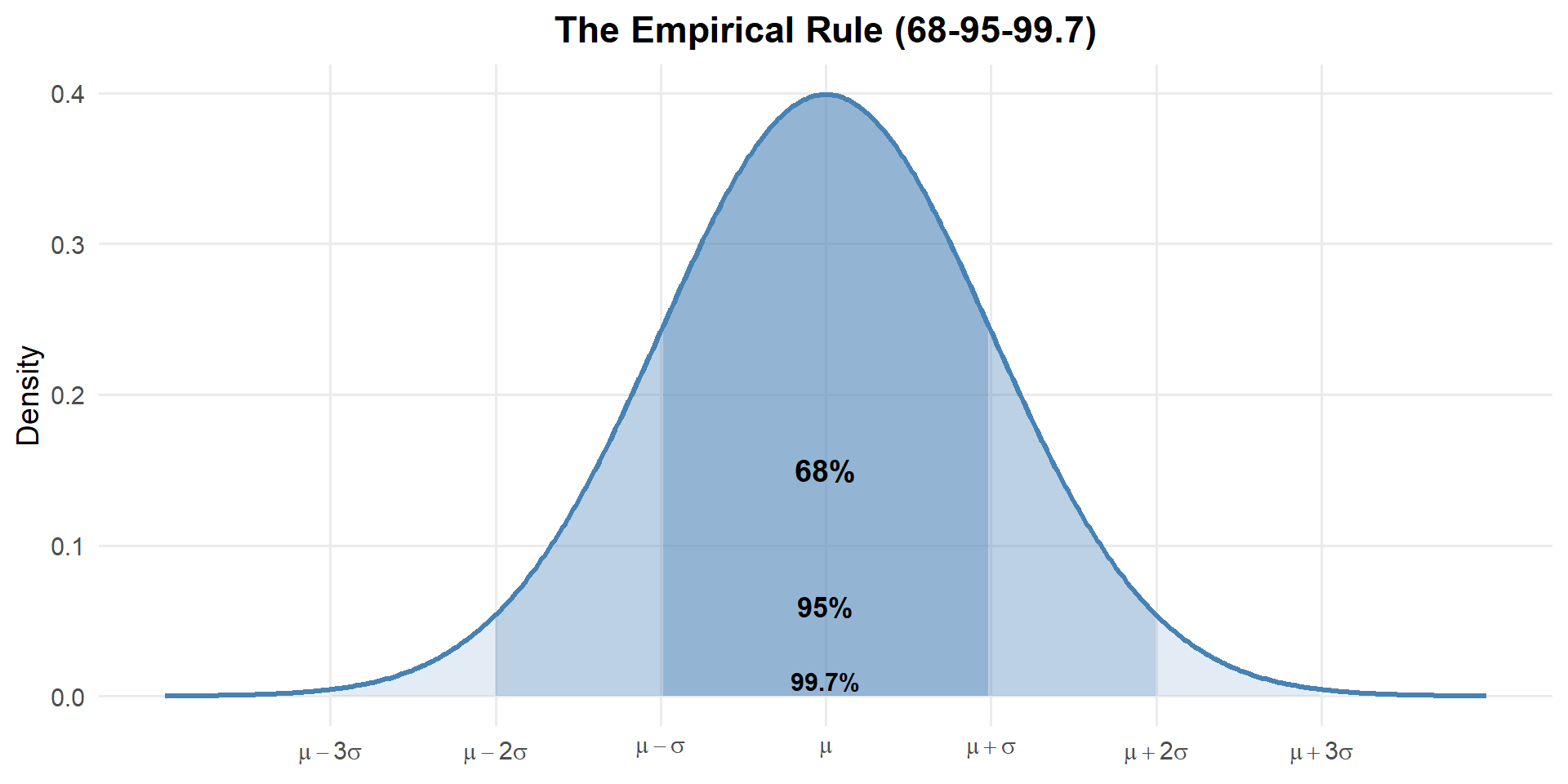 - 68% of data within \(\mu \pm \sigma\)