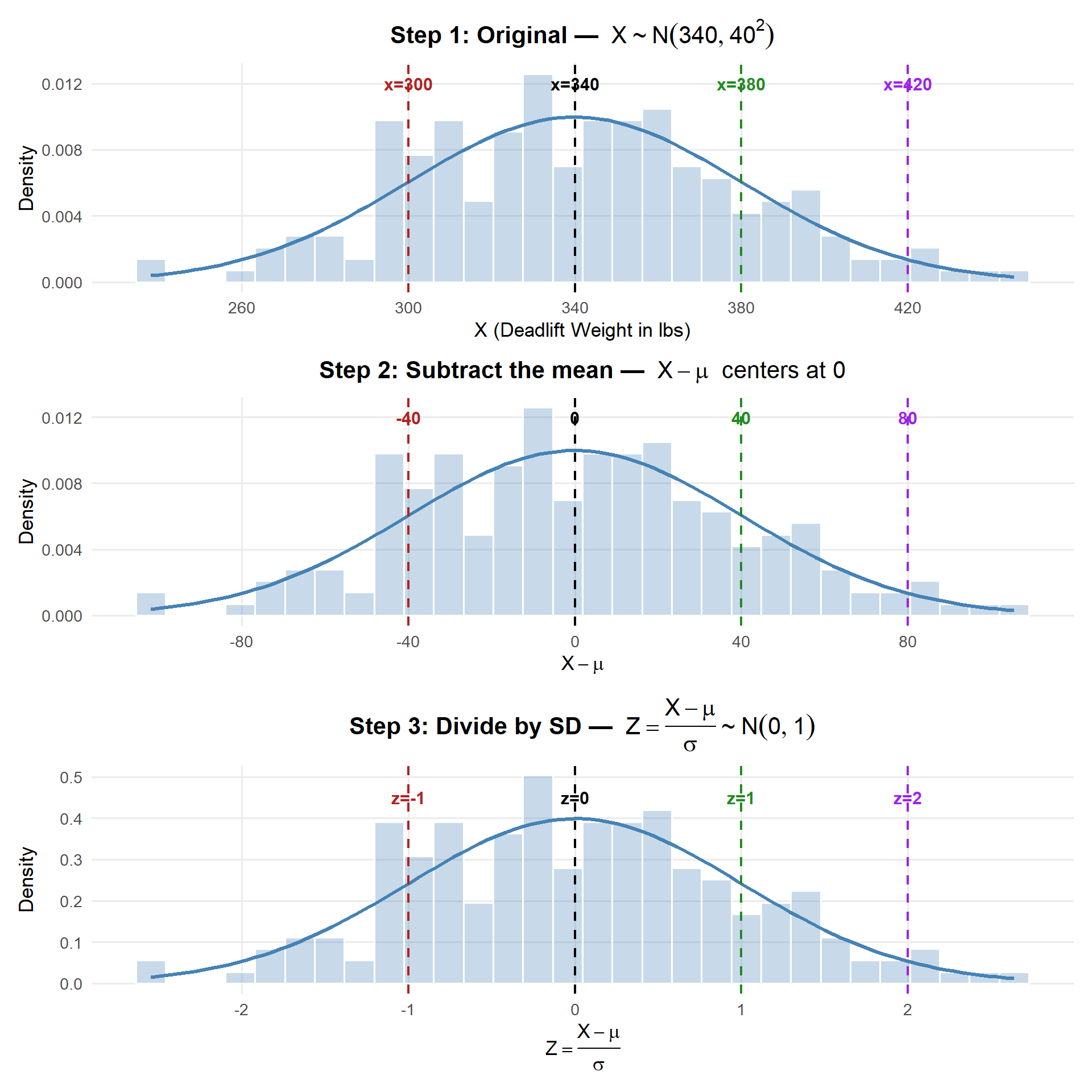 - Standardize with \(Z = \frac{X - \mu}{\sigma}\) to convert to \(Z \sim N(0,1)\)