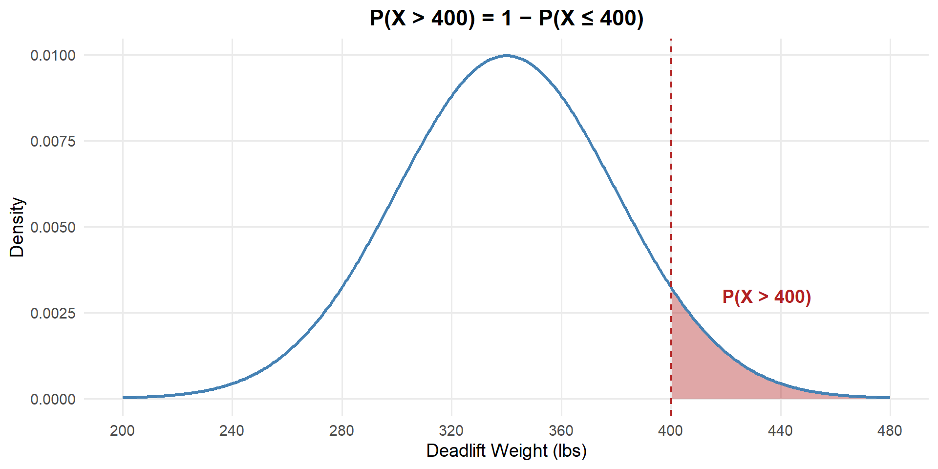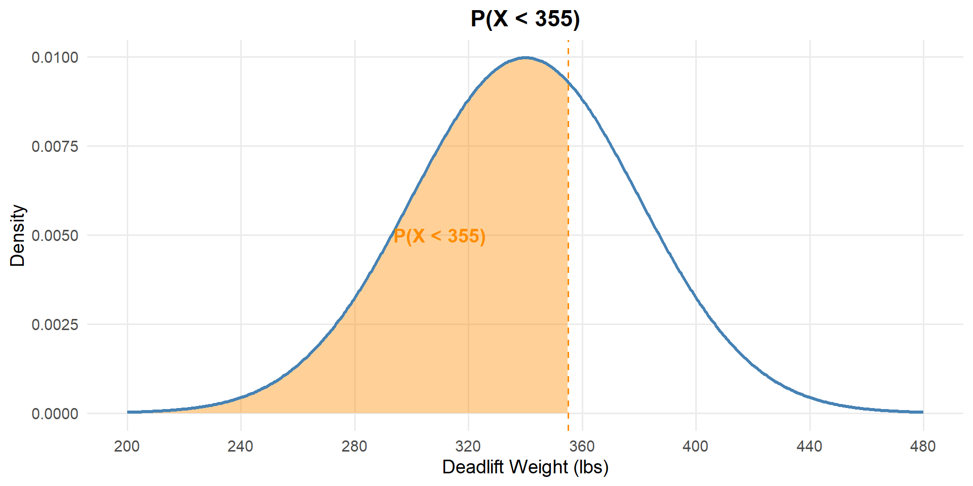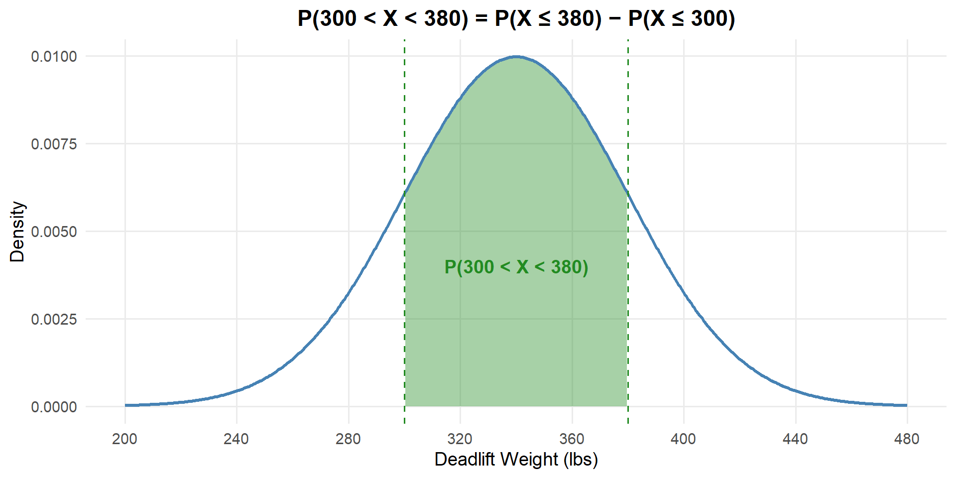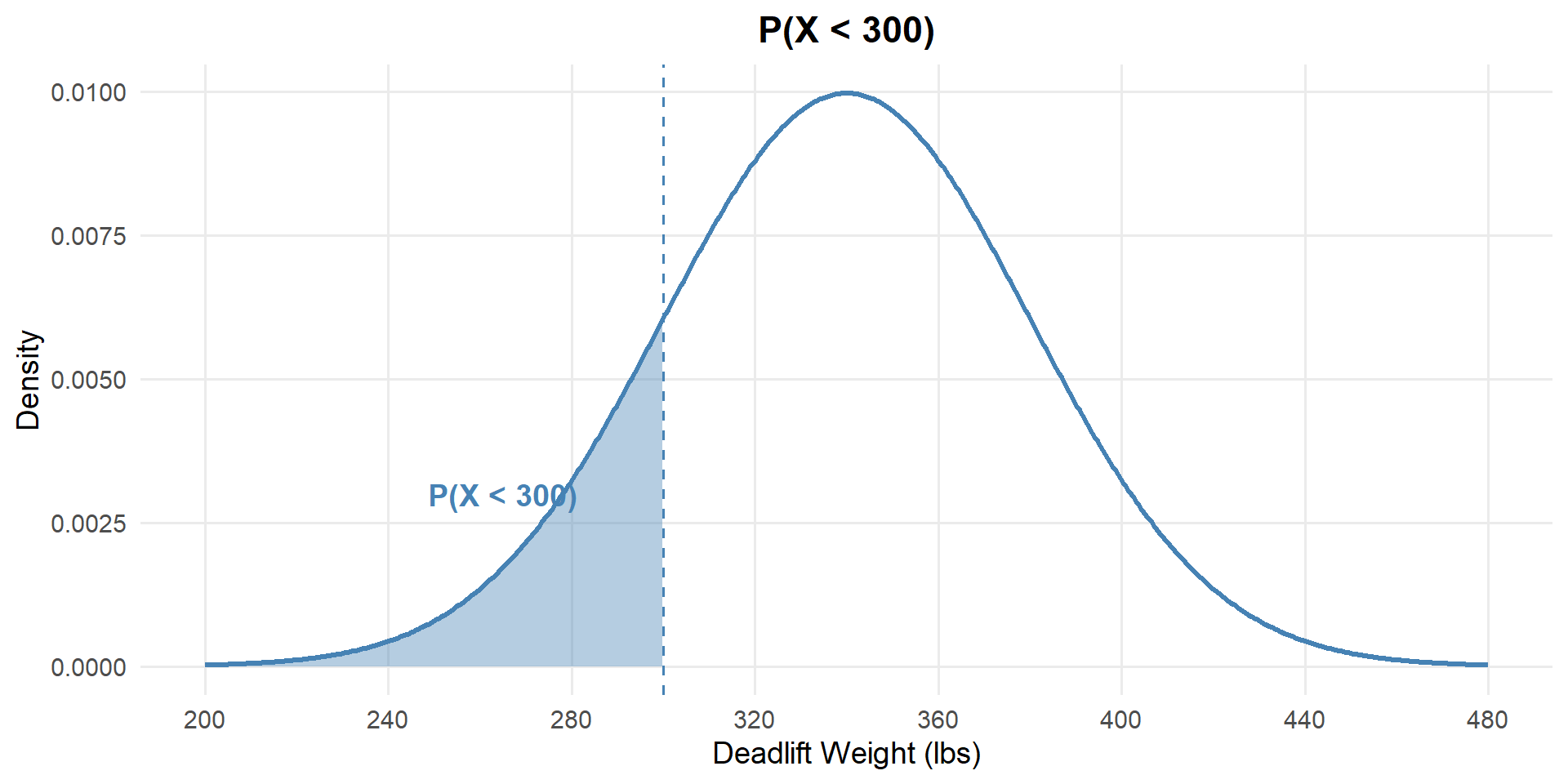 pnorm(x, mean, sd)— CDF: \(P(X \leq x)\) (forward: value → probability)qnorm(p, mean, sd)— Quantile: find \(x\) such that \(P(X \leq x) = p\) (backward: probability → value)dnorm(x, mean, sd)— PDF: \(f(x)\) (density, not probability)