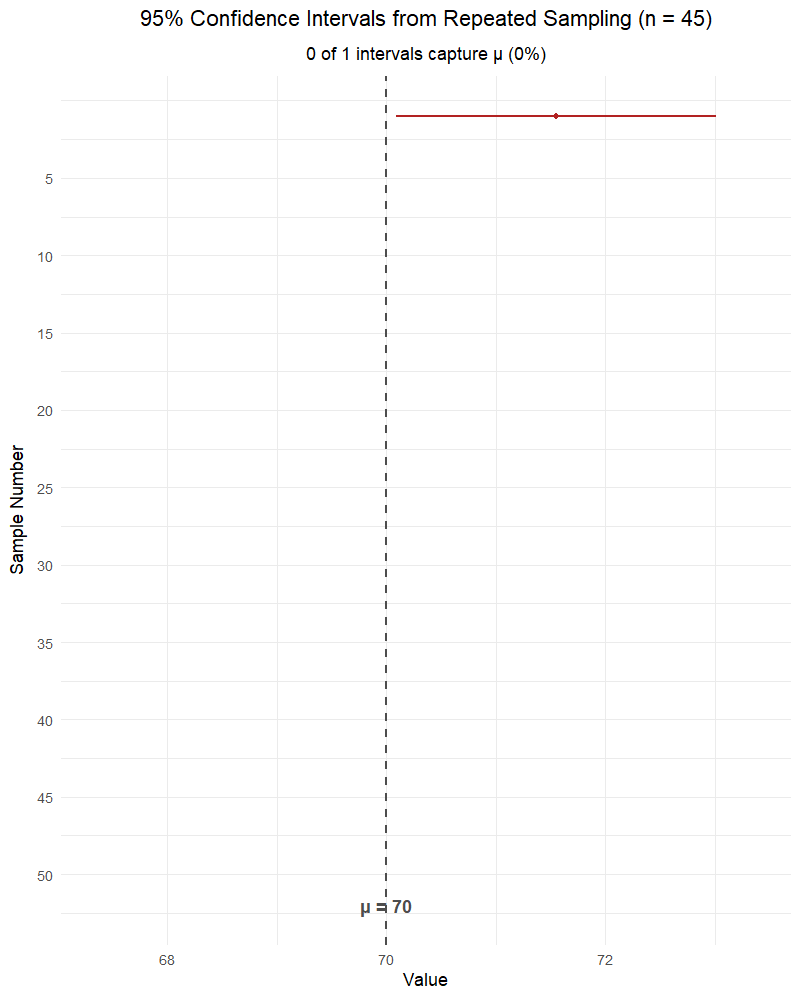 The parameter \(\mu\) is fixed — it’s not random. The interval is random (because \(\bar{X}\) is random). Once we compute the interval, \(\mu\) either is or isn’t in it — we just don’t know which. The word “confident” refers to the method’s long-run success rate, not a probability about any single interval.