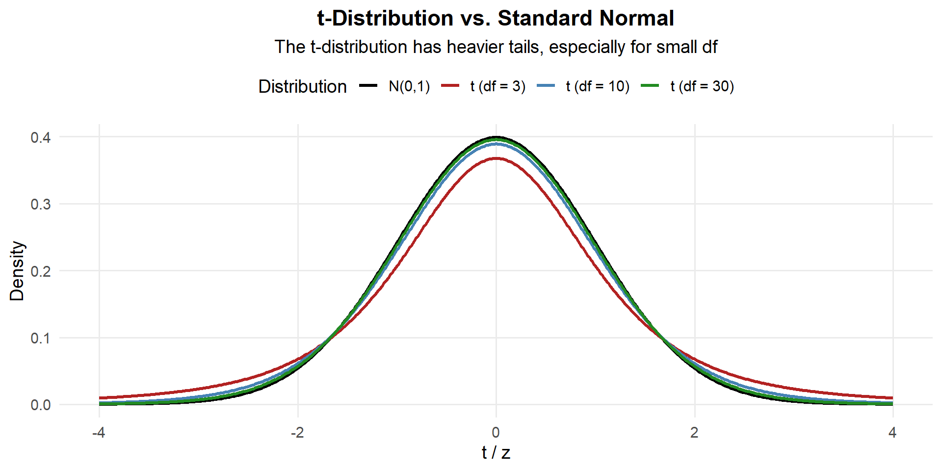 - As \(df \to \infty\), \(t \to N(0, 1)\) — which is why \(z\) works for large \(n\)