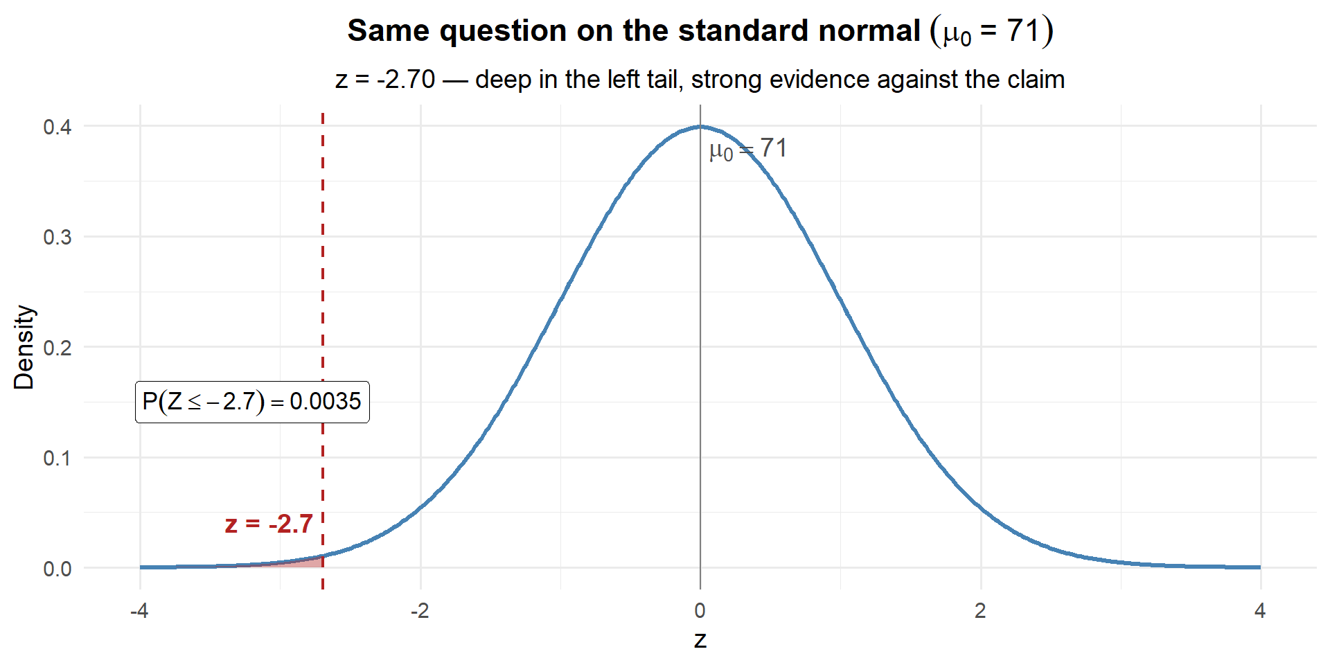 - Instant intuition: \(z = -2.70\) immediately tells you “2.7 standard errors below the claim” without knowing anything else about the problem