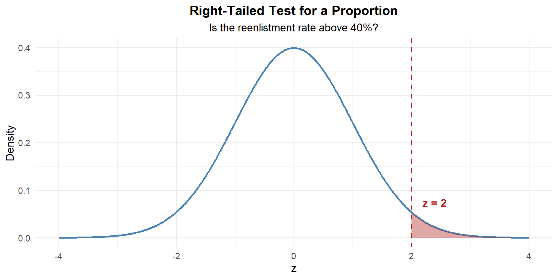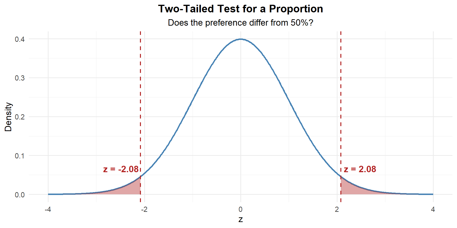 Our sample proportion is 2.08 standard errors above what \(H_0\) claims.