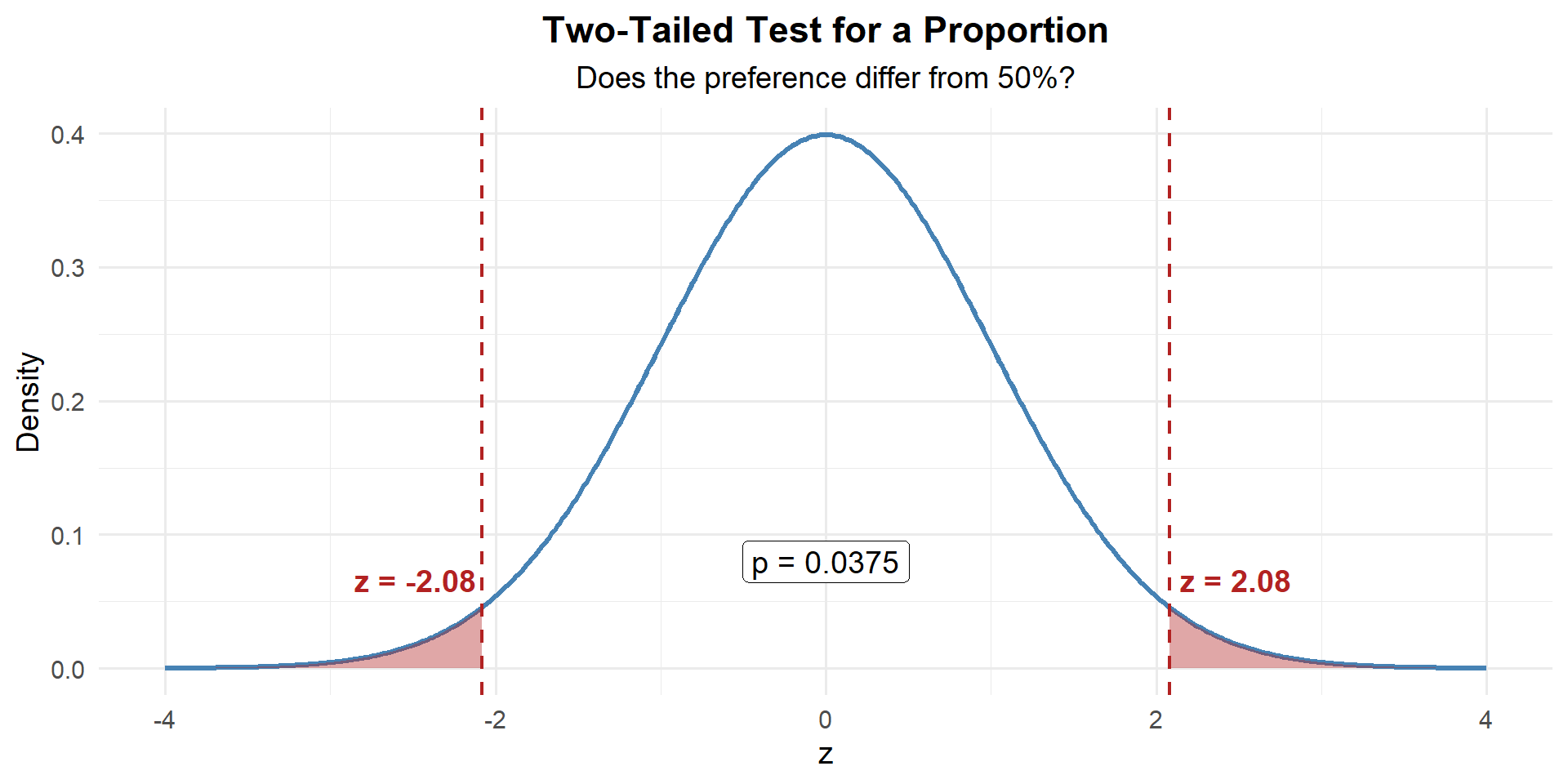 \[p\text{-value} = 2 \times P(Z \geq |2.078|) = 0.0377\]