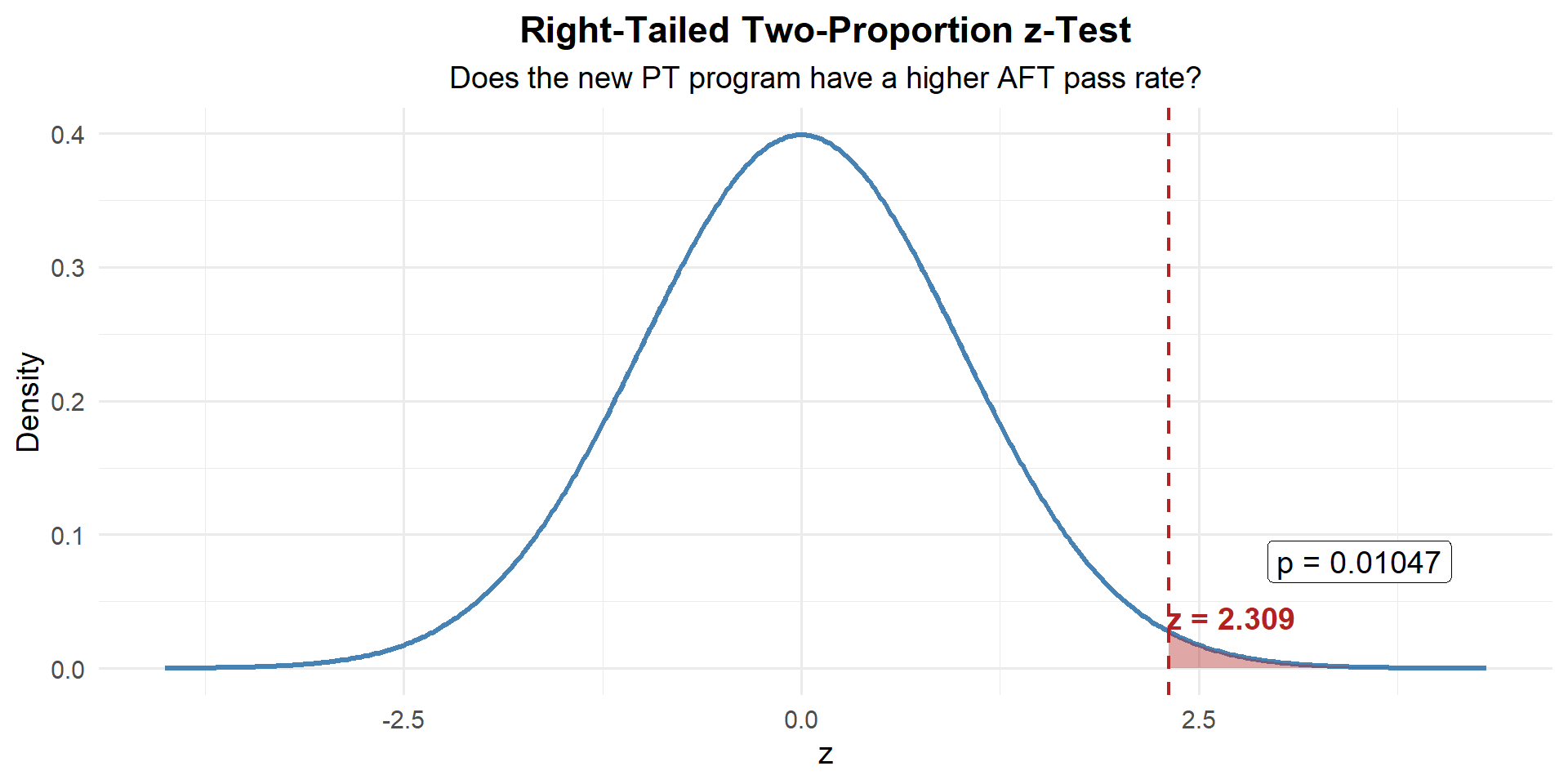 - \(p = 0.1139 > 0.05\), so we fail to reject \(H_0\). At the 5% significance level, there is not sufficient evidence that Battalion A has a higher promotion board pass rate.