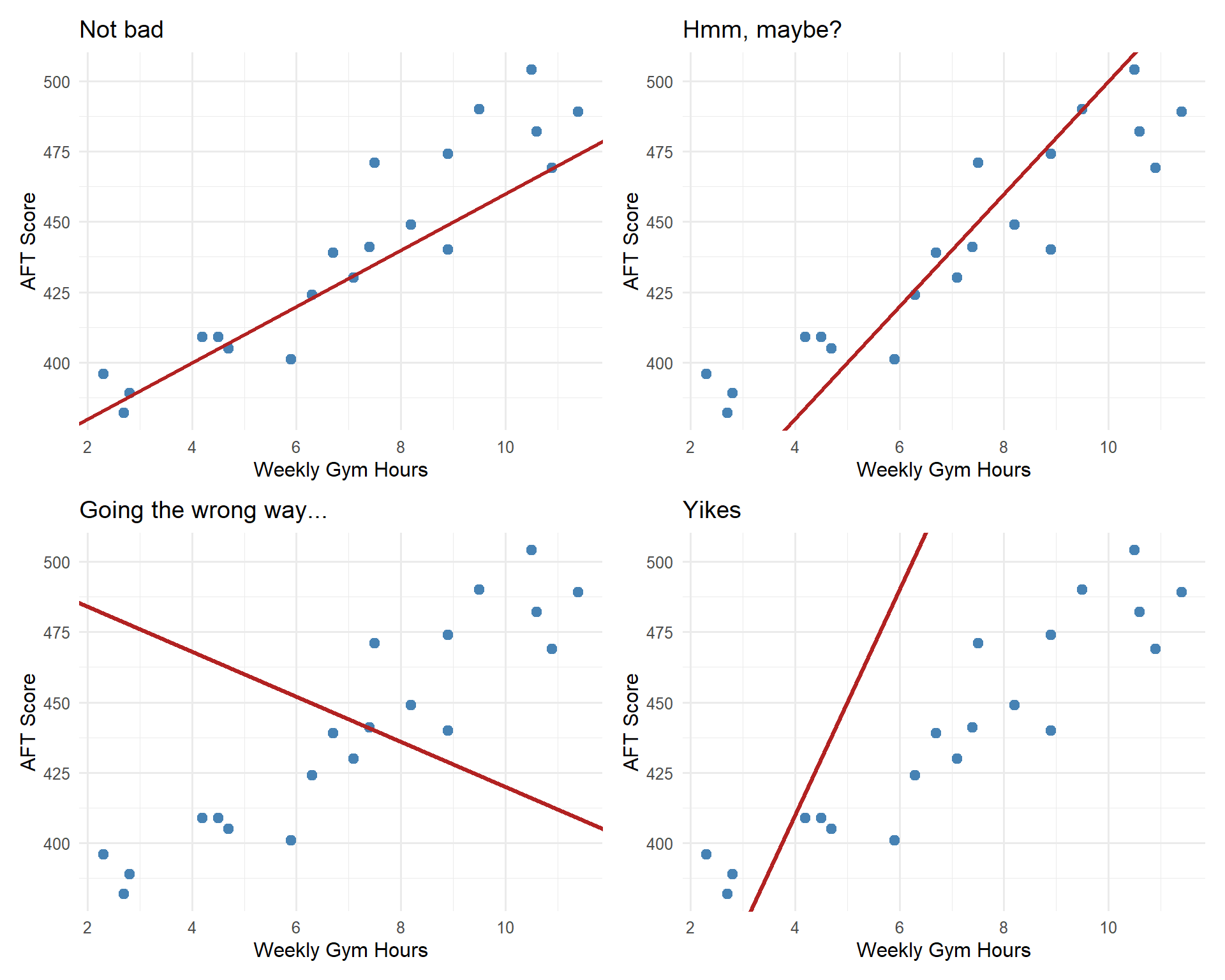 Intercept (\(b_0 = 353.42\)): A Soldier who spends zero hours per week in the gym has a predicted AFT score of 353.42 points.