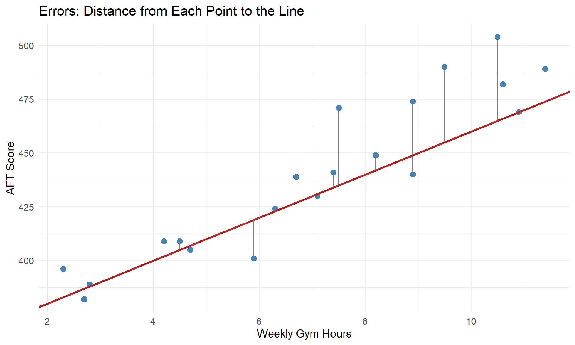 Slope (\(b_1 = 12.23\)): For each additional hour per week spent in the gym, a Soldier’s predicted AFT score increases by 12.23 points, on average.