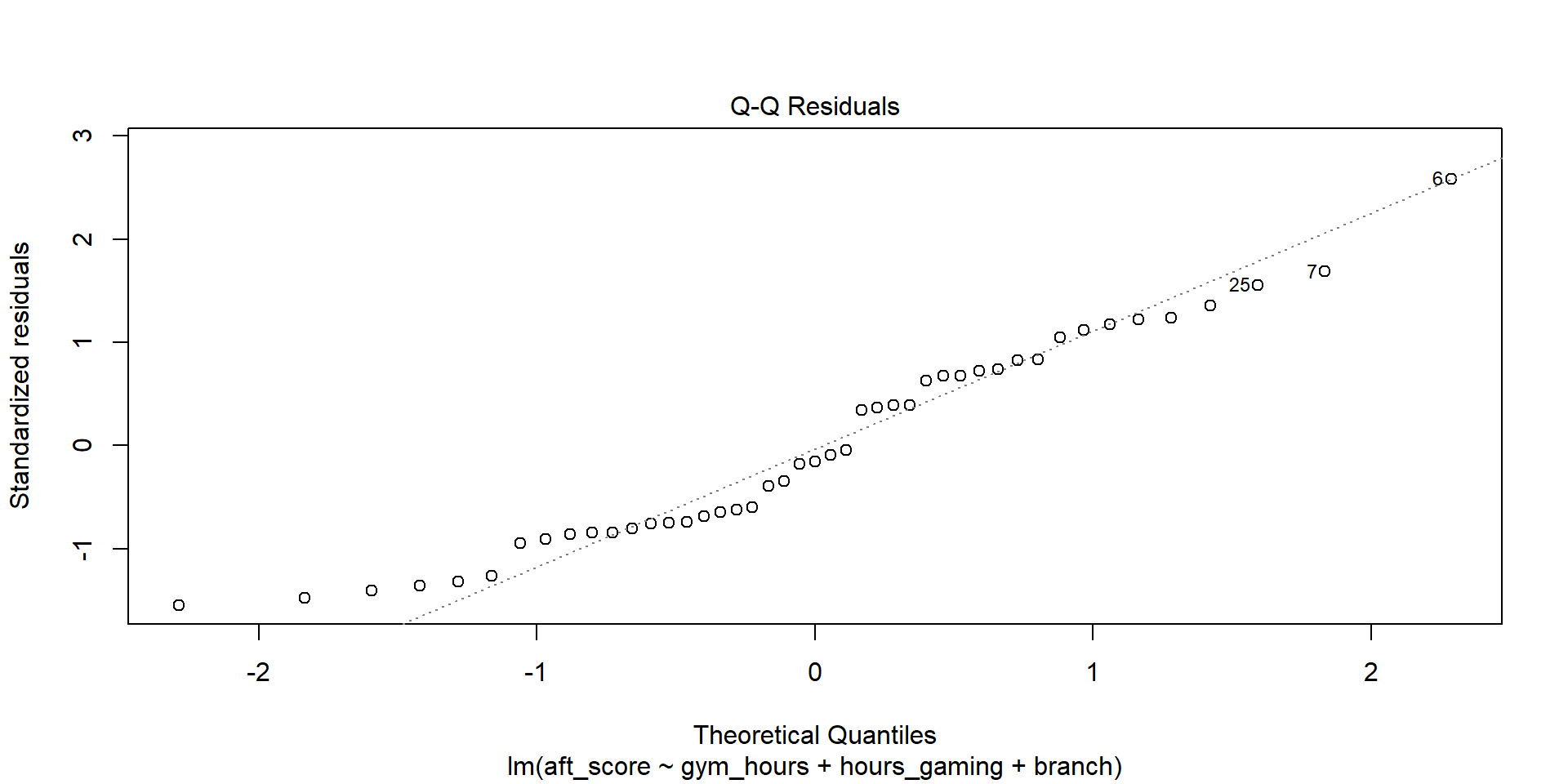 model <- lm(aft_score ~ gym_hours + hours_gaming + branch, data = soldiers)L – Linearity