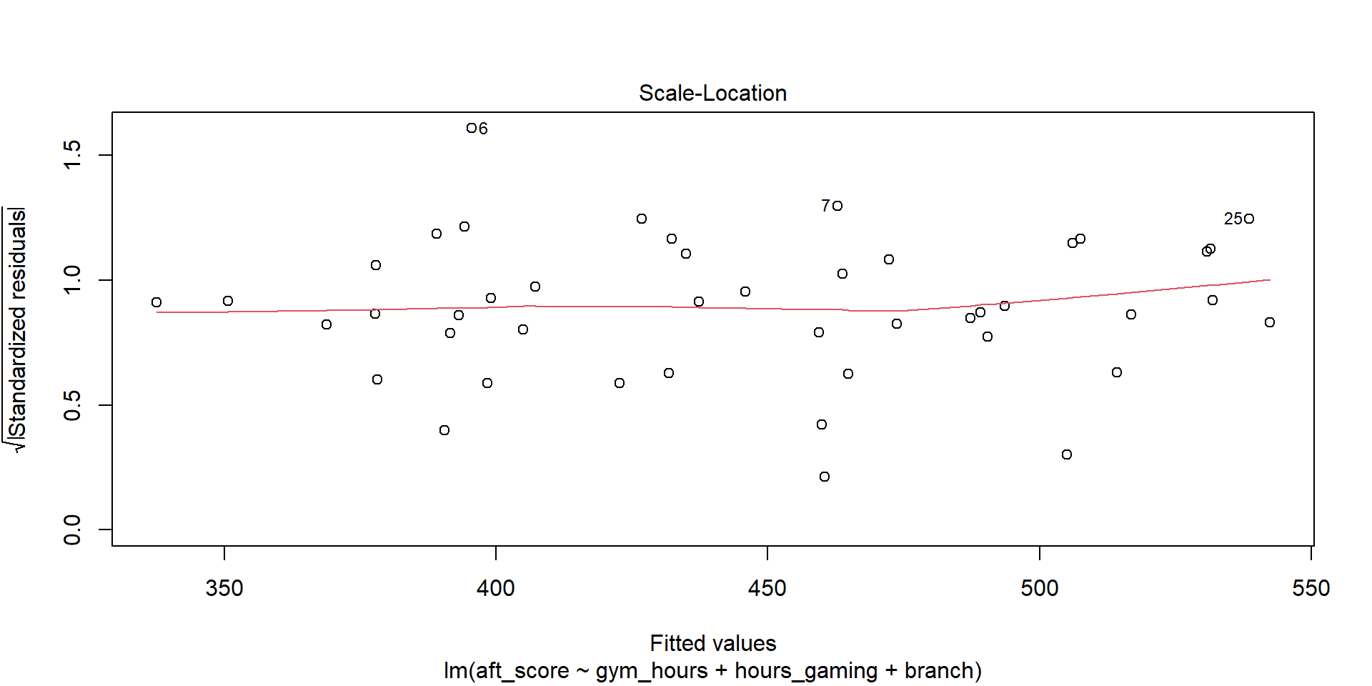 The spread of residuals should be constant across all fitted values – no fanning out or funneling in. We check with the scale-location plot: