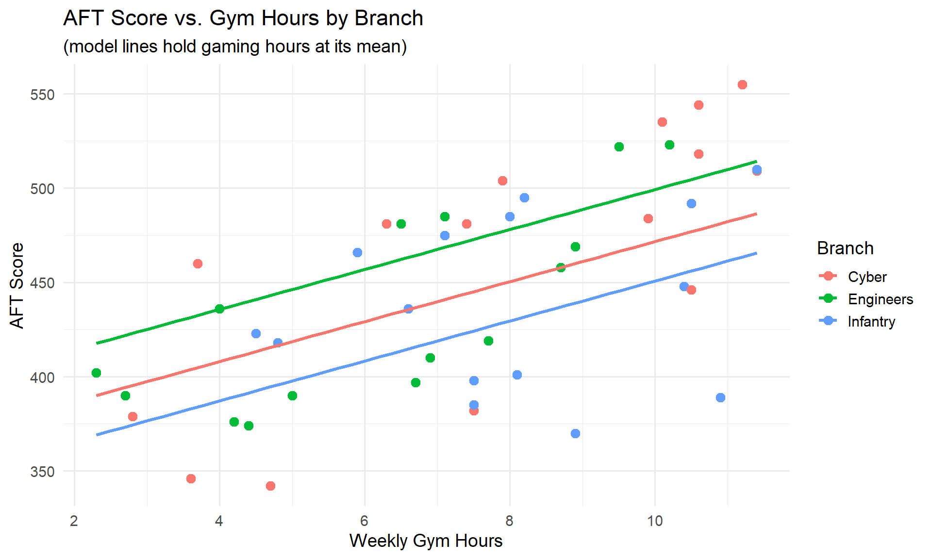Last class, we built up from a simple model to one with categorical predictors. Here’s the final model we ended with – predicting AFT scores using gym hours, gaming hours, and branch (Cyber, Engineers, Infantry):