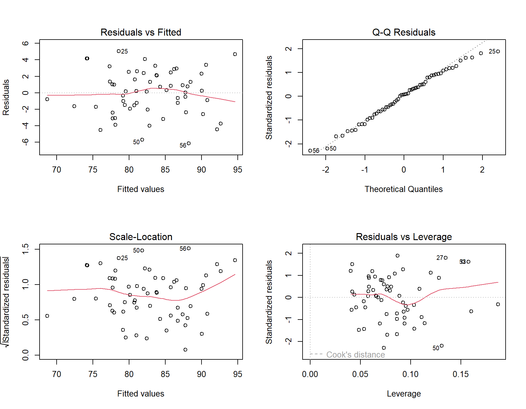 - Check with residuals vs. fitted, QQ plot, and scale-location plots