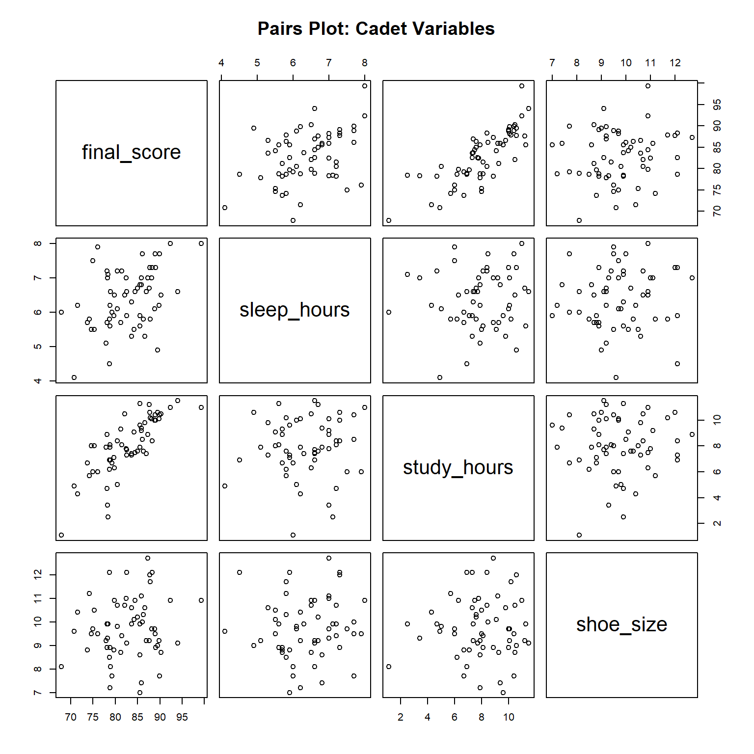\[ \text{final\_score} = \beta_0 + \beta_1 \text{sleep} + \beta_2 \text{study} + \beta_3 \text{platoon} + \beta_4 \text{shoe\_size} + \varepsilon \]