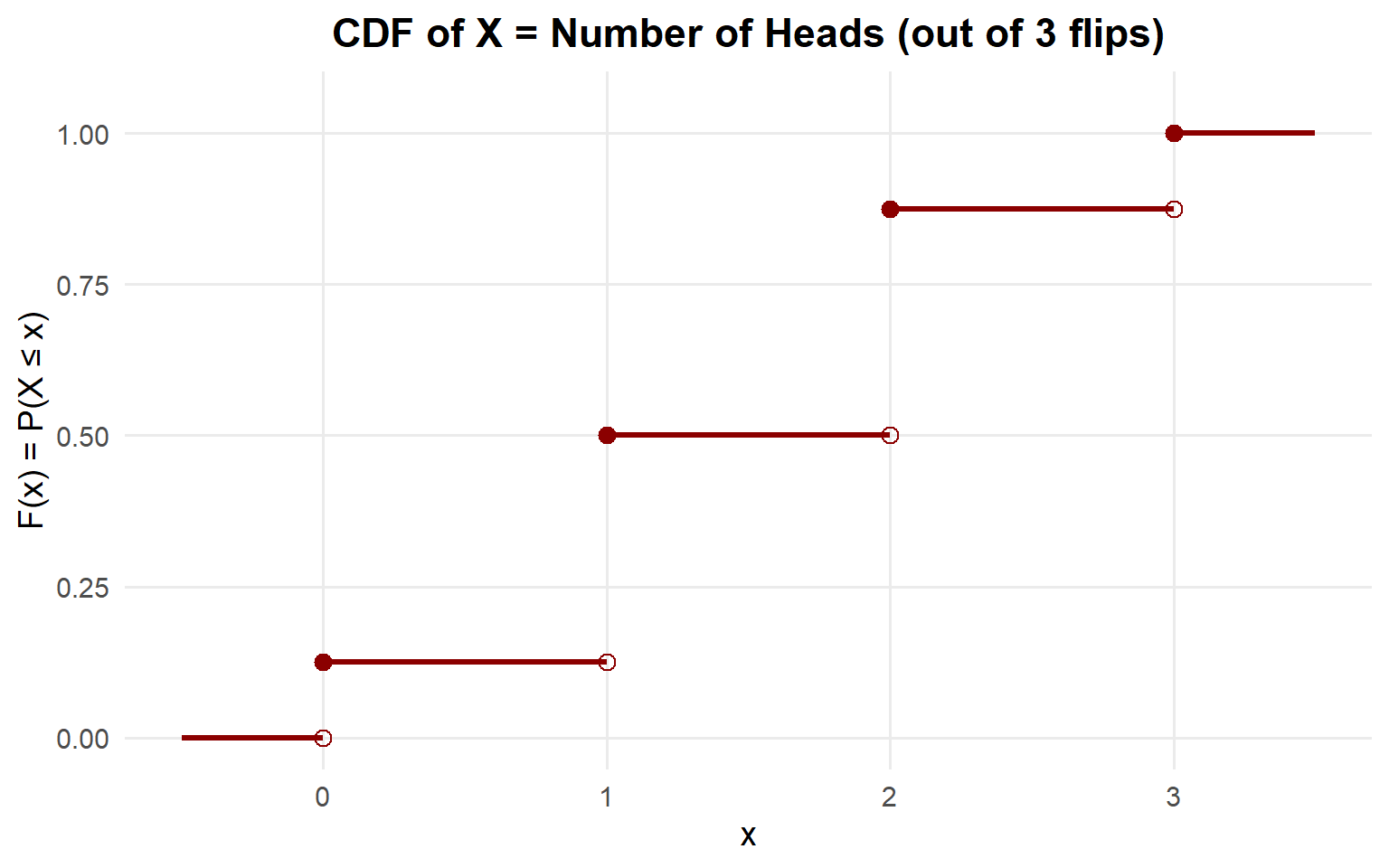 Or as a formula: \(p(x) = \frac{\binom{3}{x}}{2^3}, \quad x \in \{0, 1, 2, 3\}\)