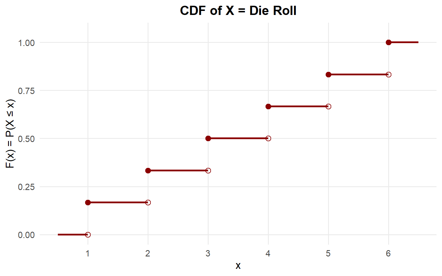 \[ F(x) = \begin{cases} 0 & x < 1 \\[6pt] \frac{1}{6} & 1 \leq x < 2 \\[6pt] \frac{2}{6} & 2 \leq x < 3 \\[6pt] \frac{3}{6} & 3 \leq x < 4 \\[6pt] \frac{4}{6} & 4 \leq x < 5 \\[6pt] \frac{5}{6} & 5 \leq x < 6 \\[6pt] 1 & x \geq 6 \end{cases} \]